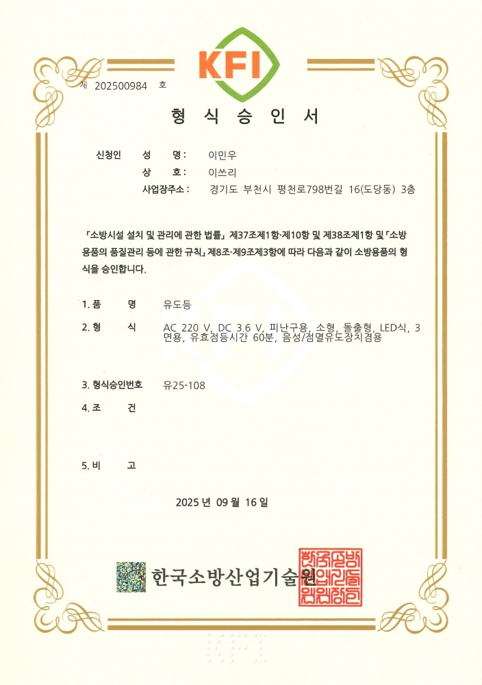 ㆍ형식: AC220V,DC3.6V,피난구용,소형,돌출형,LED식,3면용,음성/점멸유도장치겸용